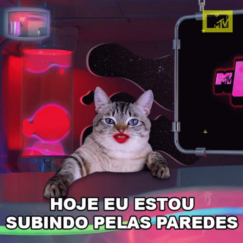 Cat with red lipstick exclaims 'Today I am climbing the walls' in a vibrant MTV Miaw setting.