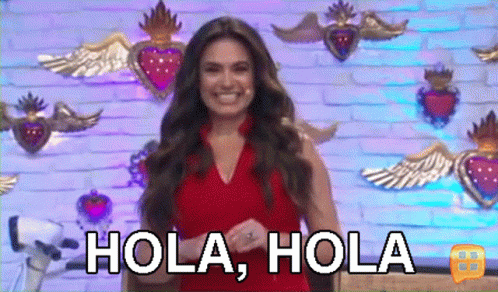 Penelope Menchaca, in a red dress, waves enthusiastically with 'HOLA, HOLA' text on screen.