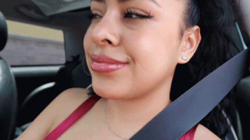 Merith Aranda smiling and making a peace sign while sitting in a car with her seatbelt on.