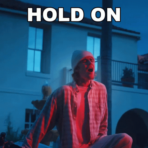 Justin Bieber performing his song 'Hold On', with the lyrics 'HOLD ON' displayed on screen.
