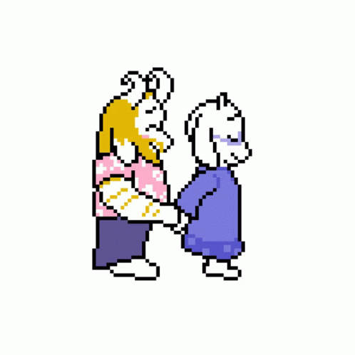 Asgore Dreemurr and Toriel, the goat-like characters from Undertale, are seen blushing and holding hands in this pixel art.
