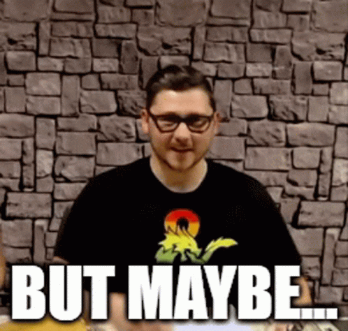 A man in glasses says "But Maybe" while gesturing, in a Dungeons & Dragons context.
