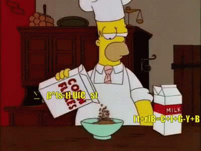 Homer Simpson, dressed as a chef, attempts to make cereal, but it spontaneously combusts, with economic equations overlaid.