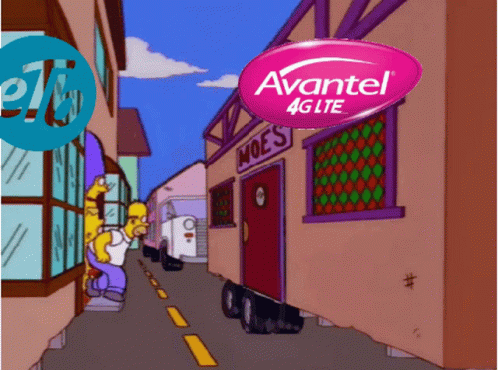 Homer Simpson runs down a street featuring Etb Colombia and Avantel 4G LTE logos.