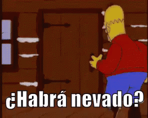 Homer Simpson opens his door to a massive pile of snow, wondering if it has snowed.