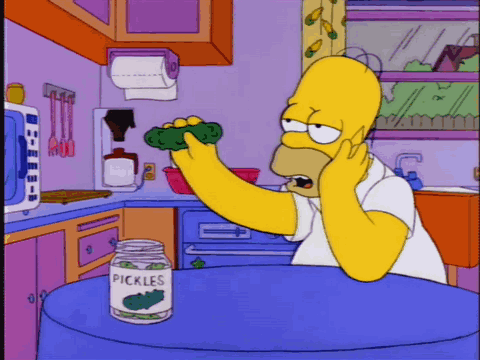 Homero Simpson, looking sad, contemplates a pickle before eating it in his kitchen.