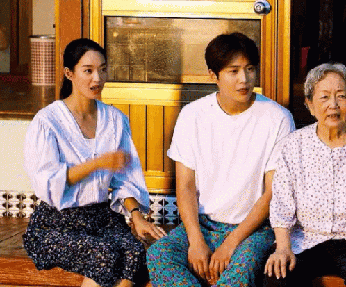 Kim Seon Ho, Shin Min Ah, and an older woman from Hometown Cha Cha Cha sitting on a porch.