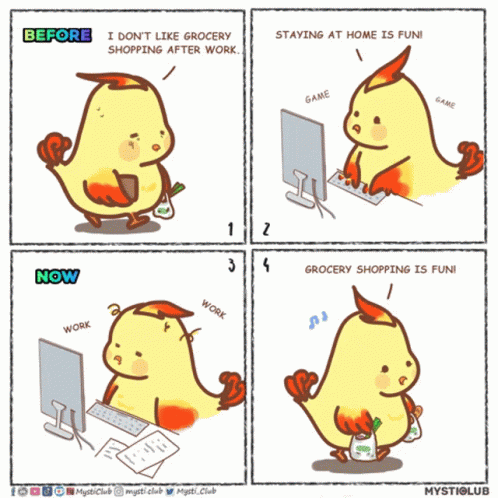 A cute cartoon bird's perspective on grocery shopping changes from chore to fun after working from home.