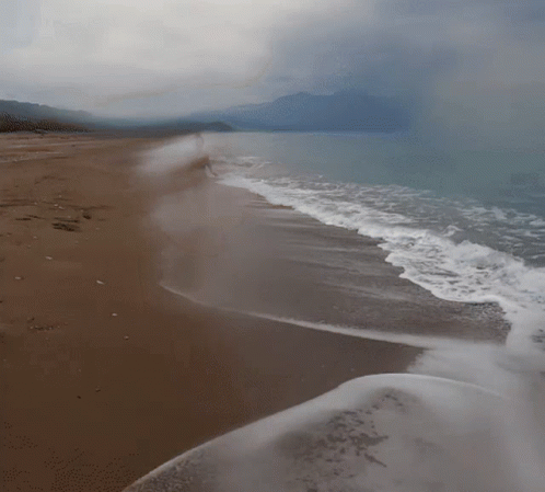 Honeymoos Mariola runs along a sandy beach next to the sea, with waves gently washing ashore.