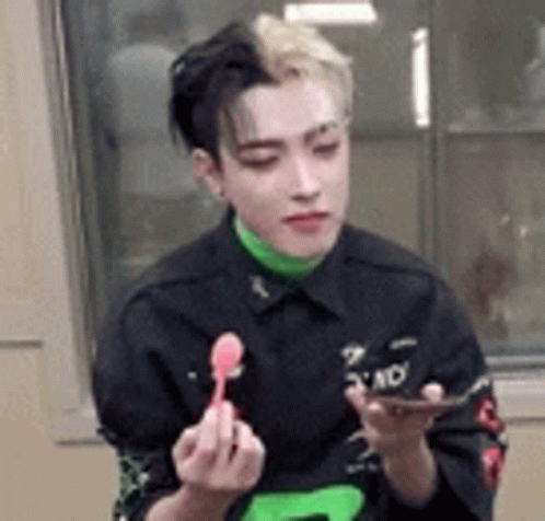 ATEEZ's Hongjoong holding a pink spoon and a phone, giving a judging or unimpressed look.