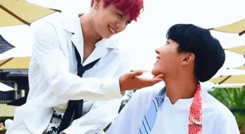 Jungkook with pink hair gently touches Hoseok's neck, sharing a sweet moment.
