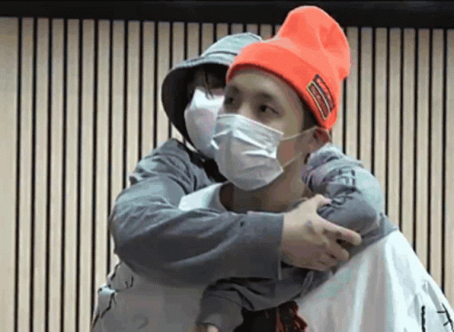 Hopekook and Koobi share a warm hug, both wearing masks and hats in a heartwarming moment.