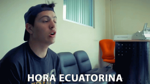 A man in a 'Hora Ecuatorina' shirt sits in a waiting room, humorously referencing the concept of arriving late.