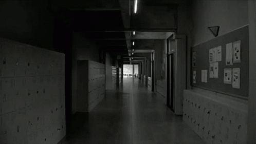 A dark, eerie black and white school hallway with lockers, creating a classic horror atmosphere.