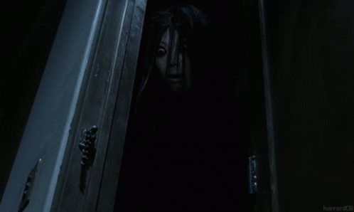 A terrifying ghost with long dark hair and wide eyes peers from a dark doorway in a horror scene.