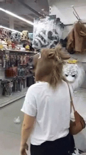 A person wearing a realistic horse head mask moves their head, making the mask's mouth open and close in a store aisle.