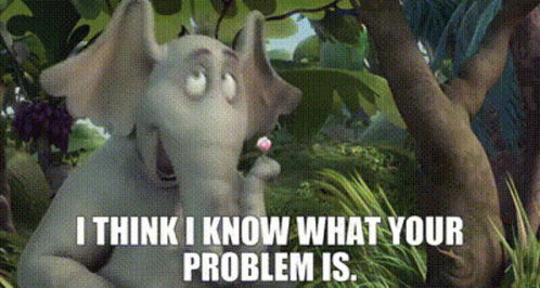 Horton the elephant from Horton Hears a Who holds a flower, delivering the iconic line, 'I THINK I KNOW WHAT YOUR PROBLEM IS.'
