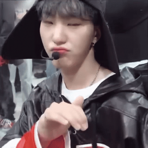 Hoshi from Seventeen makes a cute, funny face while wearing a hat and jacket, holding a microphone.