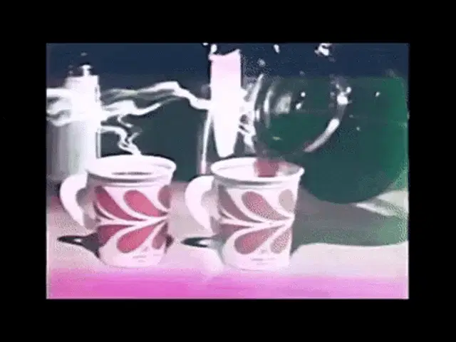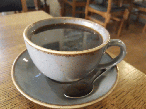 A steaming hot cup of black coffee sits on a gray saucer with a spoon on a wooden table.