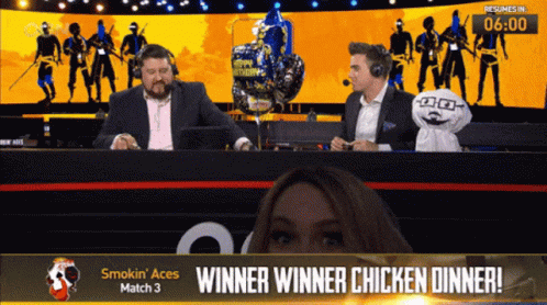 A woman enjoys a hot dog on stream while the screen displays 'Winner Winner Chicken Dinner' and a countdown.