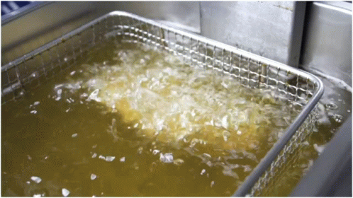 Food, likely chicken, deep frying in bubbling hot oil in a metal basket.