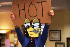 Gorg, a character with a distinctive cartoon face, holds up a cardboard sign that boldly reads 'HOT'.