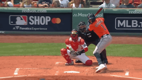 Houston Astros player Carlos Correa swings at a pitch during an MLB baseball game, captured from behind home plate.