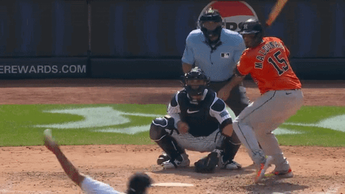 Martin Maldonado of the Houston Astros hits a baseball and performs an epic bat flip during an MLB game.
