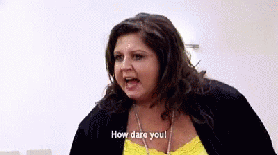 An angry woman yells 'How dare you!' with an intense expression and gestures emphatically.