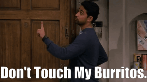 Sid from How I Met Your Father, played by Suraj Sharma, warns 'Don't Touch My Burritos' while pointing at a door.