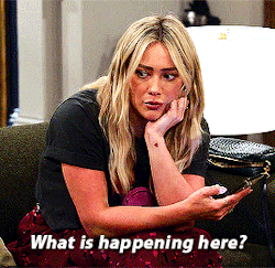 Hilary Duff as Sophie Tompkins, looking confused while holding her phone and asking 'What is happening here?'