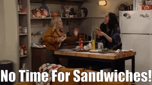 Sophie Tompkins (Hilary Duff) and a friend in a kitchen, reacting to the urgent message 'No Time For Sandwiches!'