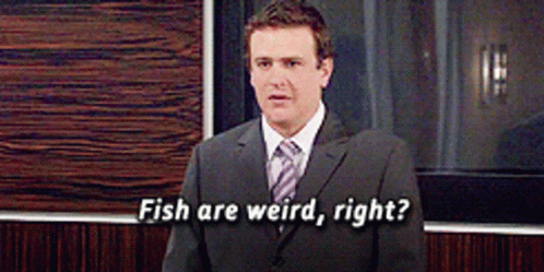Marshall Eriksen from How I Met Your Mother humorously questions the strangeness of fish during a meeting.
