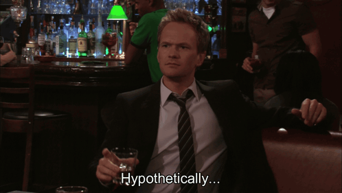Barney Stinson from How I Met Your Mother says 'Hypothetically...' while holding a drink in a bar.