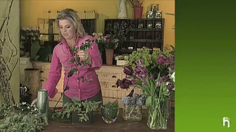 Woman in pink shirt demonstrates how to arrange flowers, cutting stems for a beautiful display.