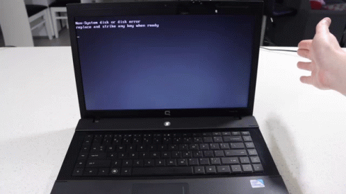 A laptop shows a 'Non-System disk or disk error' message before being violently smashed with a hammer.