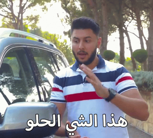 A man in a striped polo shirt stands next to a car, gesturing towards it. The Arabic caption reads 'This sweet thing'.