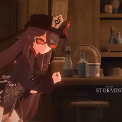 Hu Tao, from Genshin Impact, shows off her groovy dance moves in a lively setting.