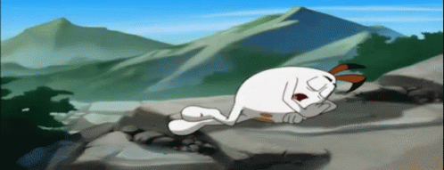 Huevo, the cartoon egg character, wakes up from a nap on a rock and stretches in a mountain landscape.