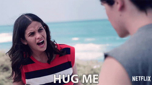 Hayley Woods, played by Ariel Mortman, intensely demands a hug from a man on a beach, from Netflix's Greenhouse Academy.
