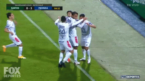 Pachuca soccer players celebrate a goal against Santos Laguna during the Guard1anes 2020 playoffs, broadcast on Fox Deportes.