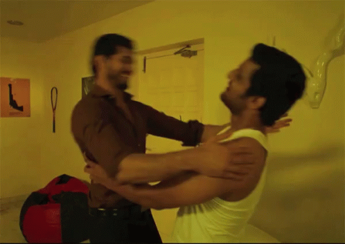 Two men share a warm embrace, a moment of bromance and reunion, one in a white tank top.