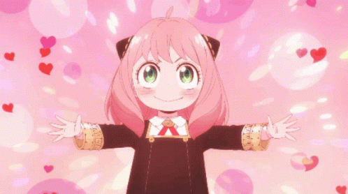 Anya Forger from Spy x Family offers a heartwarming hug, surrounded by floating pink hearts.