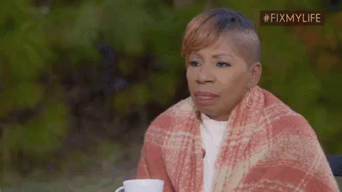 Iyanla Vanzant gives a confused and surprised reaction while wrapped in a blanket, holding a cup.