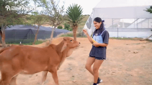 Karen Polinesia interacts playfully with a brown calf in a rural setting.