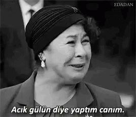 Hulya Acik laughing joyfully in a black and white clip, wearing a turban and pearl earrings.