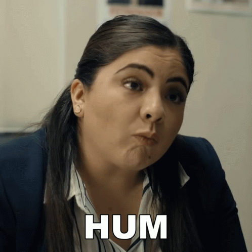 Luz Aldán makes a funny, skeptical face with the word 'HUM' displayed below her, conveying doubt or contemplation.
