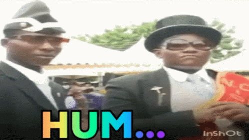 The Coffin Dance meme featuring men in suits and hats, with 'HUM...' text on screen.