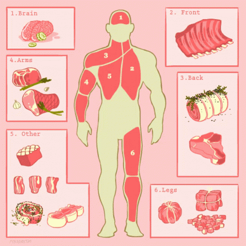 A diagram illustrating a human body divided into various meat cuts, humorously labeled by body part.