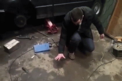 A man performs a fire trick in a garage, creating a sudden burst of flames from the ground.